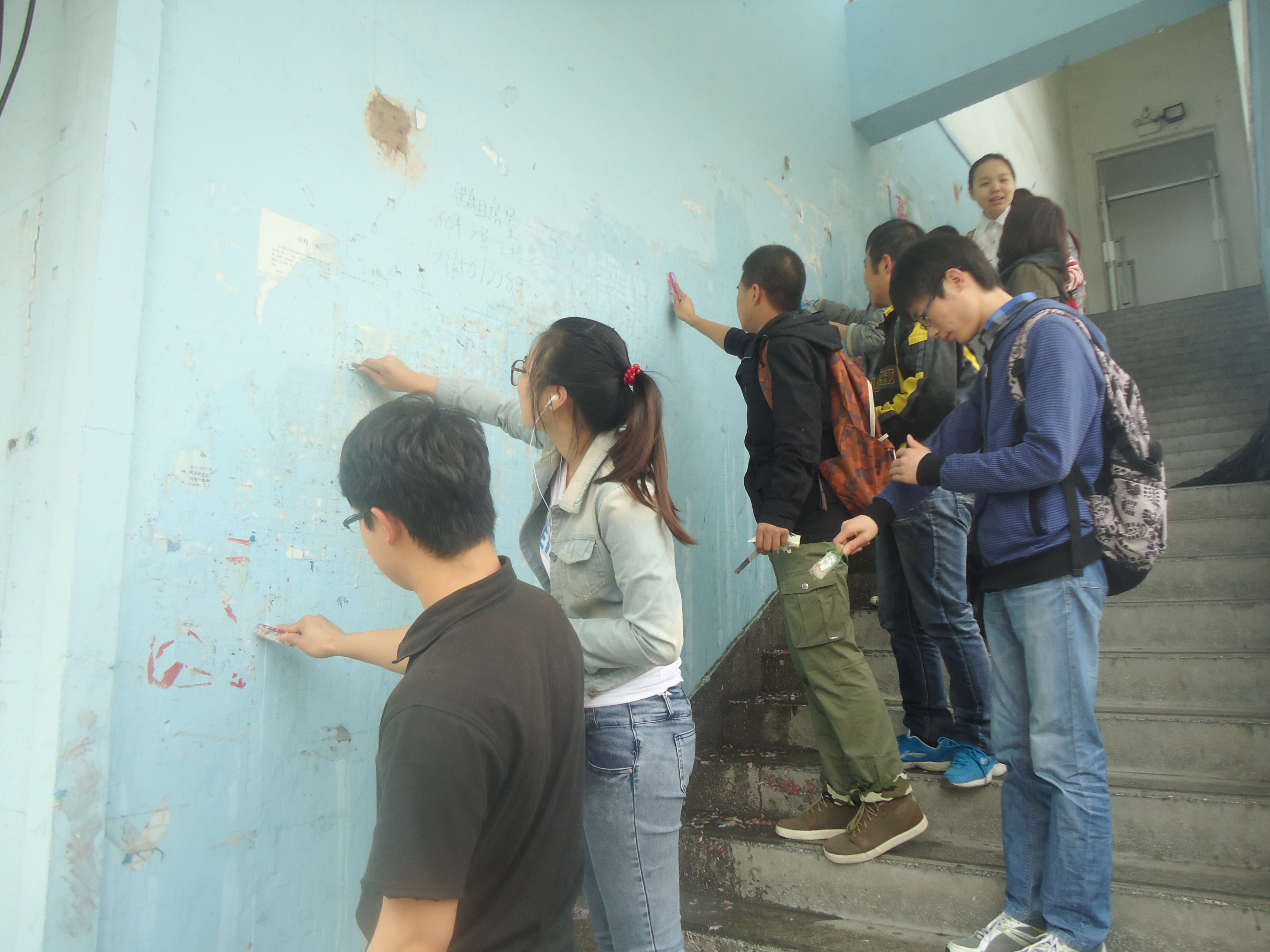 5月10日上午,外国语公司召集志愿者在外语楼集合并由员工干部带队分别到了莘子园,四食堂等区域开始了广告清理,垃圾清扫活动。清理过程中,同学们不怕脏不怕累,认真仔细地清理了四食堂等广告墙上的违章广告,为改善校容校貌做出了重大贡献。最后,同学们还捡拾了校园公路遗留垃圾,铲除树上残留胶带,引得路过老师和同学的称赞。