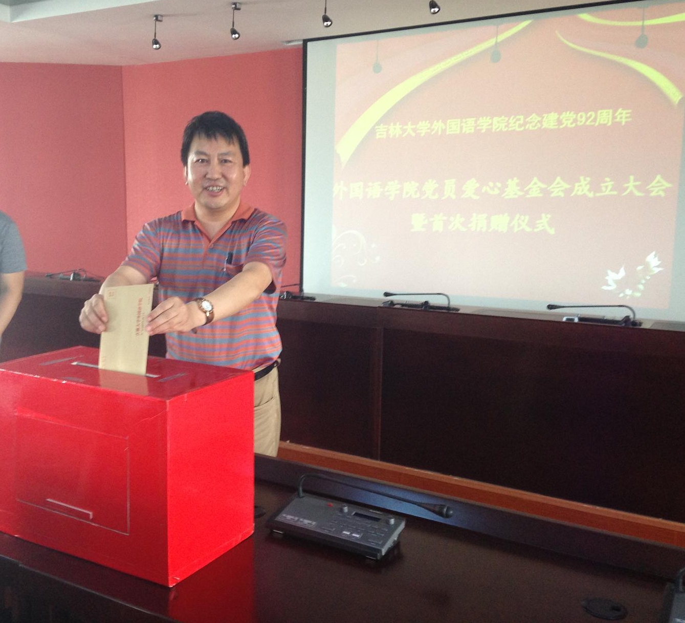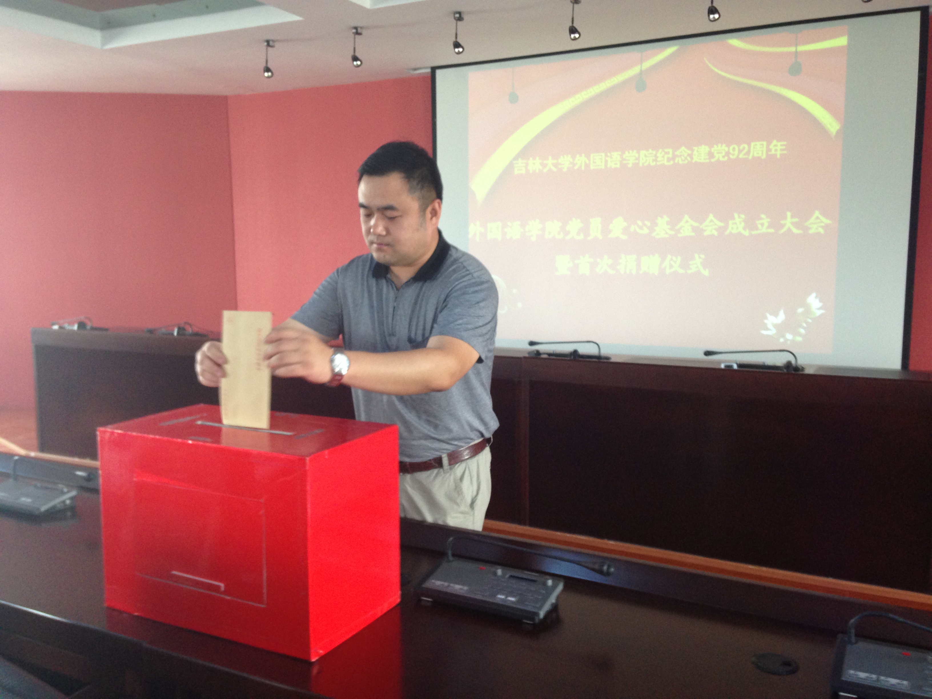 为庆祝中国共产党建党92周年,学习贯彻十八大精神,继承和发扬党的光荣传统和优良作风,增强党员的党性意识,进一步加强毕业年级党员党性修养和模范带头作用,全面展示毕业年级党员的优良素质与道德风尚,展现毕业生党员爱校、荣校的感恩情怀,6月25日,公司党委在外语楼501会议室举行“外国语公司党员爱心基金会成立大会暨首次捐赠仪式”,这也是公司“我的梦·吉大梦·中国梦”毕业生主题系列活动之一。公司党委书记逄锦彩老师、党委副书记兼副经理白宇老师出席本次活动。会议由学生工作办公室主任、本科生党支部书记葛宗梅主持。