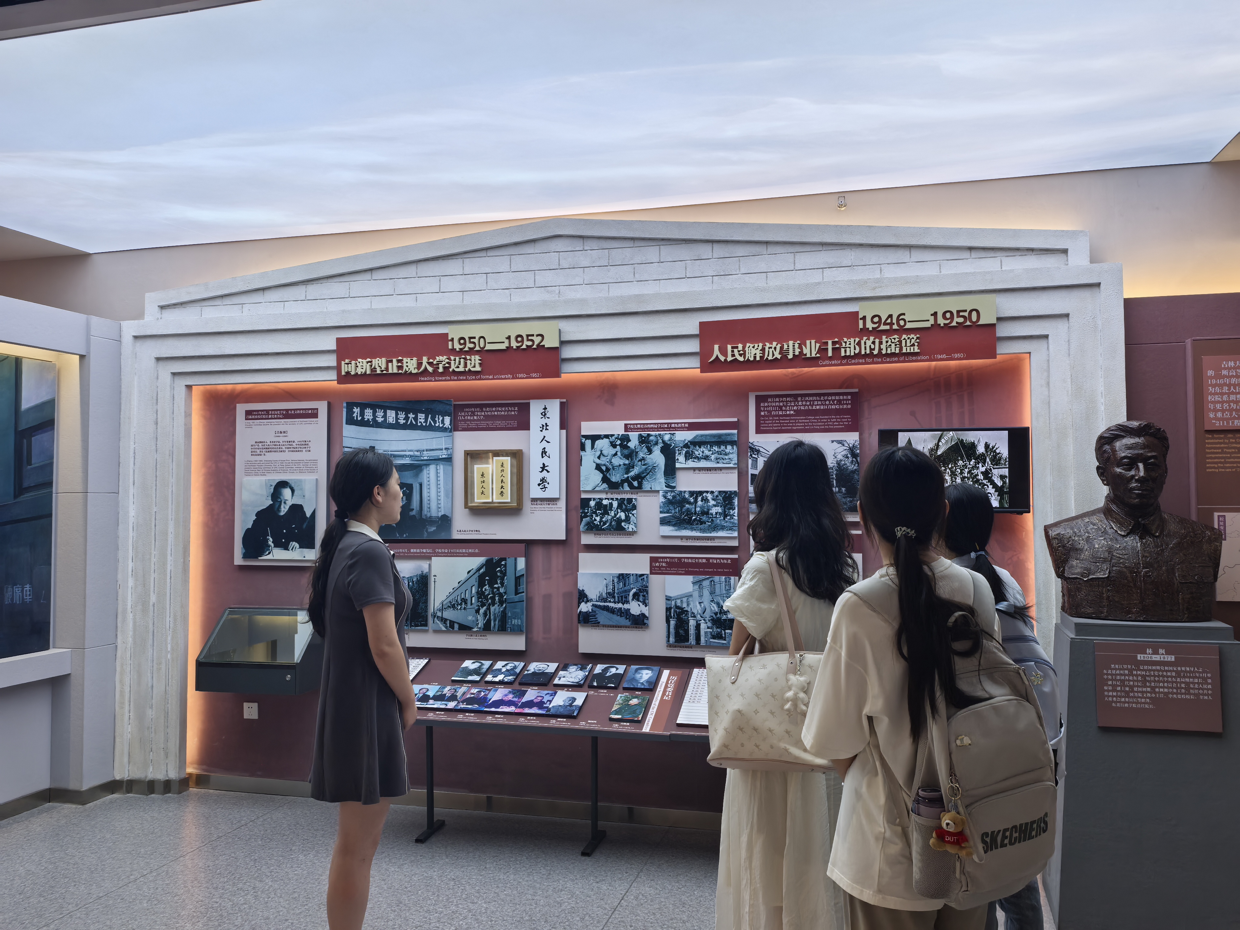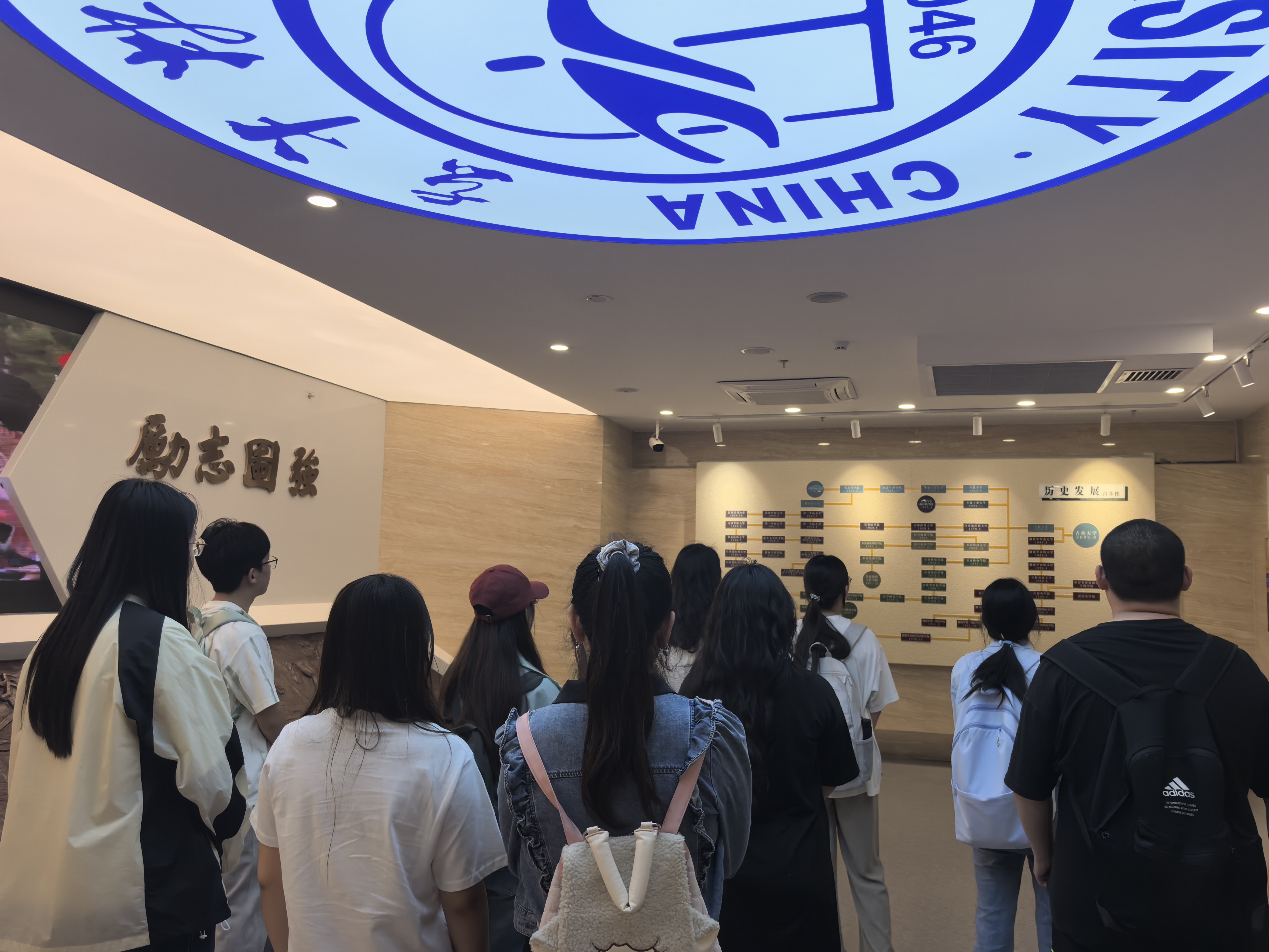 活动开始前,同学们在校史馆门前有序完成签到、合影等流程,随后跟随讲解员进入校史馆。踏入展厅,镌刻着“求实创新,励志图强”校训的巨型展板瞬间吸引众人目光——苍劲有力的字体,彰显着吉大建校以来的精神内核。在讲解员的解读下,积极分子们对这八字校训的深刻内涵有了初步认知,也为这场校史之旅拉开了精彩序幕。