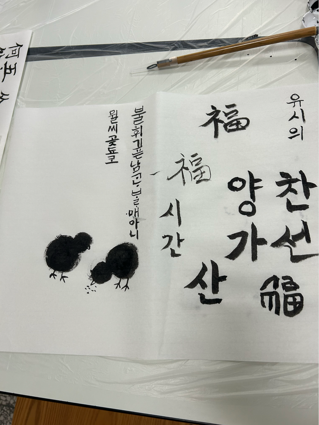 本次韩国语协会准备了用于书写的宣纸以及毛笔等书写工具供同学们使用。在活动现场,何文晴讲述了韩国文字的来历,带着同学们一起辨认了韩语中的外来词、固有词与汉字词。同学们纷纷表示对韩语有了更加深刻的了解。随后,便开始了书写环节。同学们在宣纸上尽情挥洒热情,写出了自己学到的韩国文字以及祝福语。同时,朝文系的外教老师也来到了活动现场。两位外教老师提笔写下了“사랑해요 한글”,即“我爱韩文”。同学们的热情被充分点燃。同时,我们还指导了其他语系以及其他公司的同学学习一些简单的韩语单词以及日常用语。